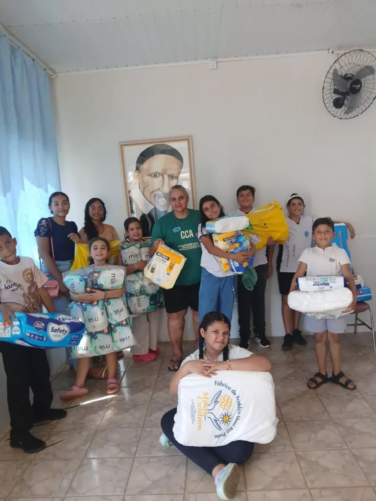 Estiveram presentes no Lar São Vicente de Paulo, em Formosa-GO, mais de 200 pessoas, entre crianças e adolescentes das CCAs, orientadores, coordenadores e confrades e consócias das conferências de adultos para a entrega das fraldas geriátricas. Fomos recebidos pela consócia Karina Nunes e pelo confrade Tiago Prado, que explicaram o funcionamento do Lar e organizaram um momento interativo de alongamento. Em seguida, realizou-se a visita aos idosos que residem no Lar. Momento marcado por muitas emoções. Agradecemos, especialmente, a toda equipe do Lar São Vicente de Paulo que organizou um delicioso lanche da tarde com salada de frutas e bolos para nos receber.