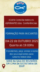 Dia 22 de outubro de 2025, a ECAFO realizou uma formação para iniciantes de todas as unidades vicentinas, na sede do CCU/MG às 19h.