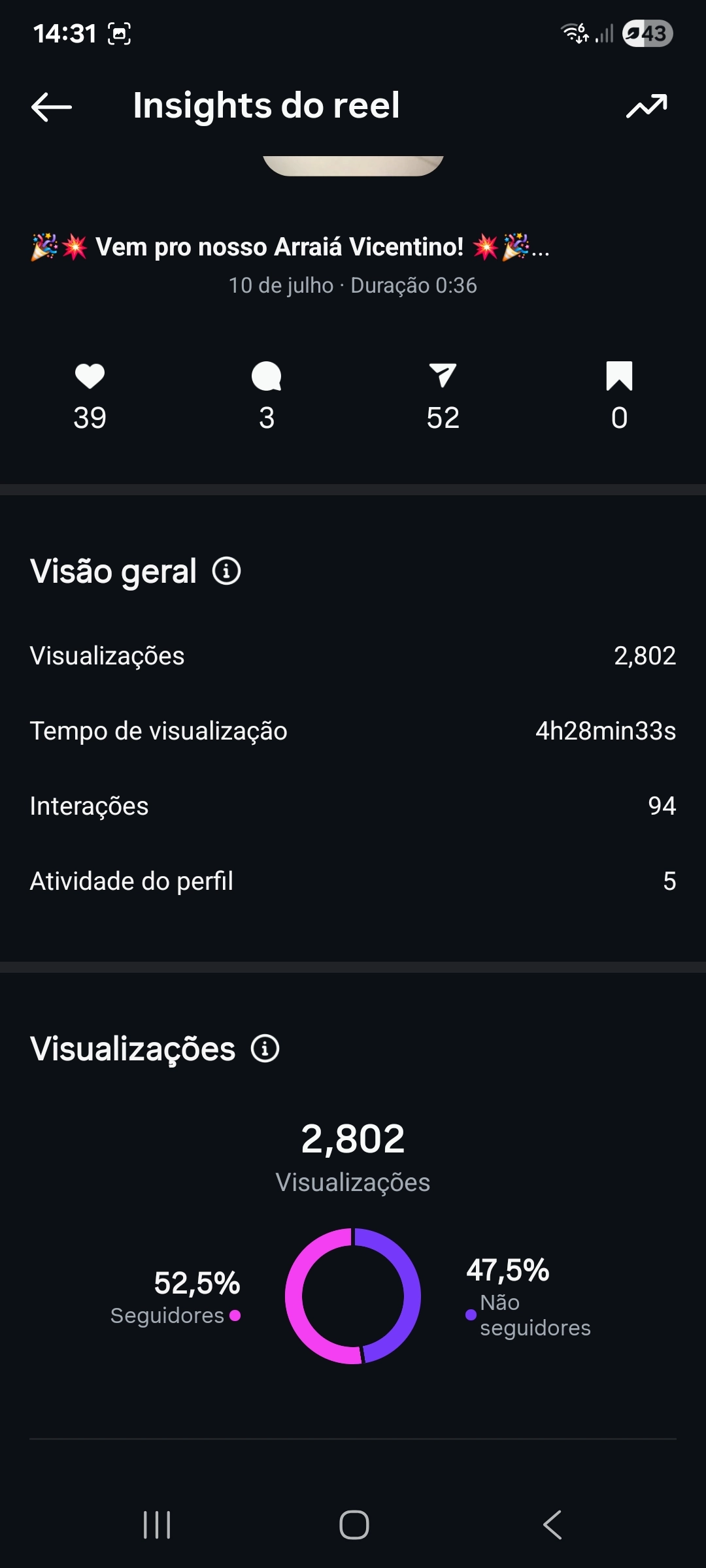O Instagram vem melhorando as métricas, aumentando as visualizações e interações nos posts. O DECOM esteve presente no arraiá fazendo cobertura pelos stories do que estava acontecendo no arraiá.